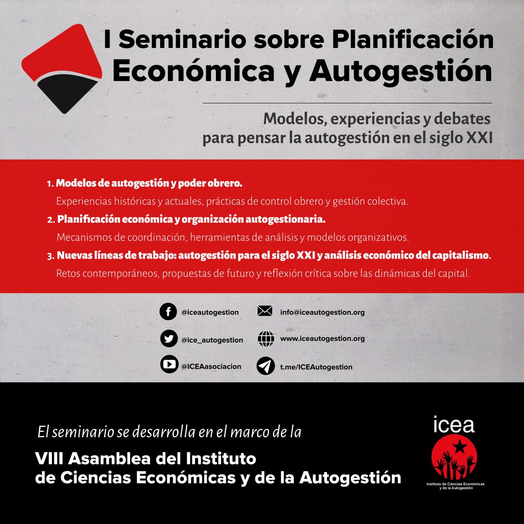 El Instituto de Ciencias Económicas y de la Autogestión (ICEA), de cara a su próxima asamblea, va a organizar una serie de seminarios online que tendrán lugar en próximas fechas (orientativamente entre el 12 y el 14 de diciembre de 2025). Estos encuentros buscan fomentar el intercambio de experiencias, fortalecer la transmisión de conocimiento y aportar herramientas útiles para organizaciones, movimientos sociales y sindicatos de inspiración libertaria y autogestionaria.